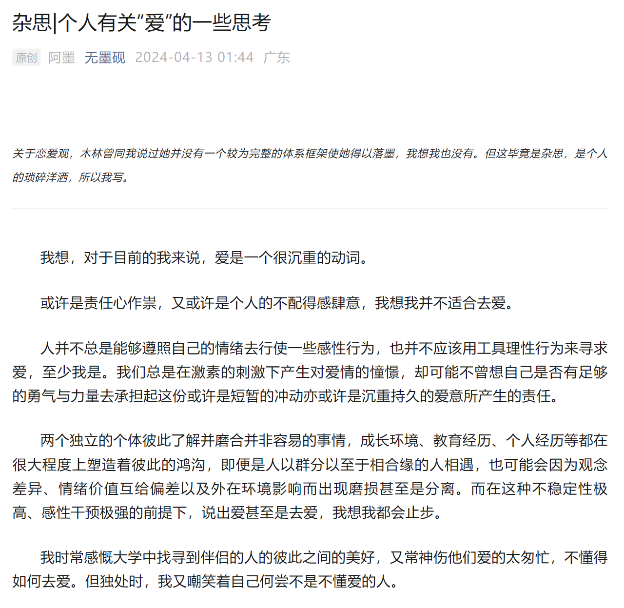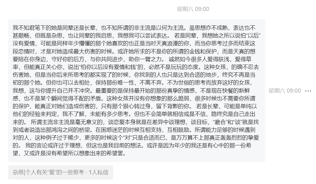 我试图用GPT帮我想几个,但目前ai终究是一个信息处理工具,并不能够给予我太多满意的地方。感叹小南老师之公众号“木林深”的唯美,我深思其是否也能如此这般动人,最终绞尽脑汁想出来了这么一个符合我现实性质却又无半点唯美度的名字———“无墨砚”