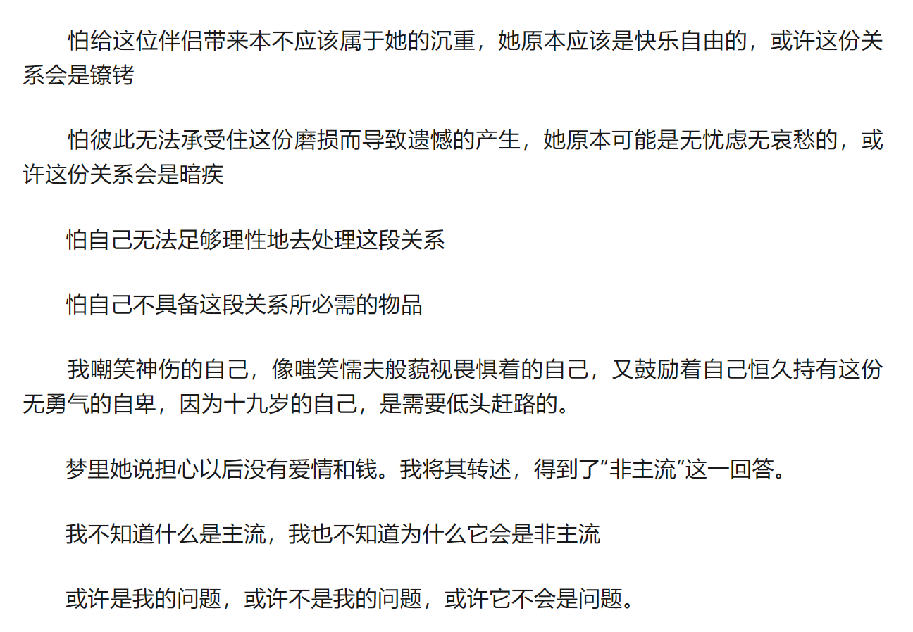24年4月12号晚。我又一次梦见她。梦中她说怕以后没有爱情和钱,她不想那样。我没说话。